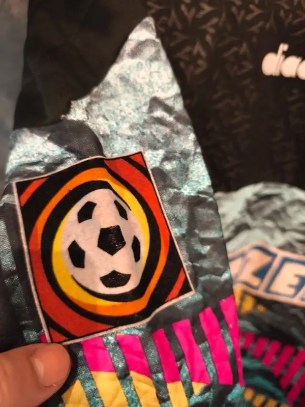 Er war sich leider aber nicht mehr sicher, ob das Trikot damals ohne Wappen getragen wurde, oder ob es sich im Nachhinein gelöst hat.